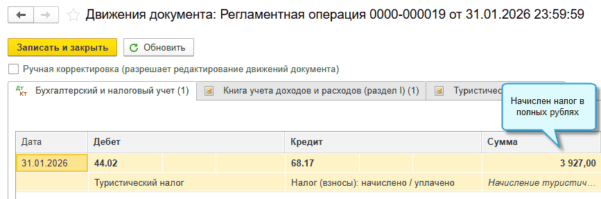 Полный интерфейс: меню «Операции - Закрытие периода - Закрытие месяца - Расчет туристического налога».