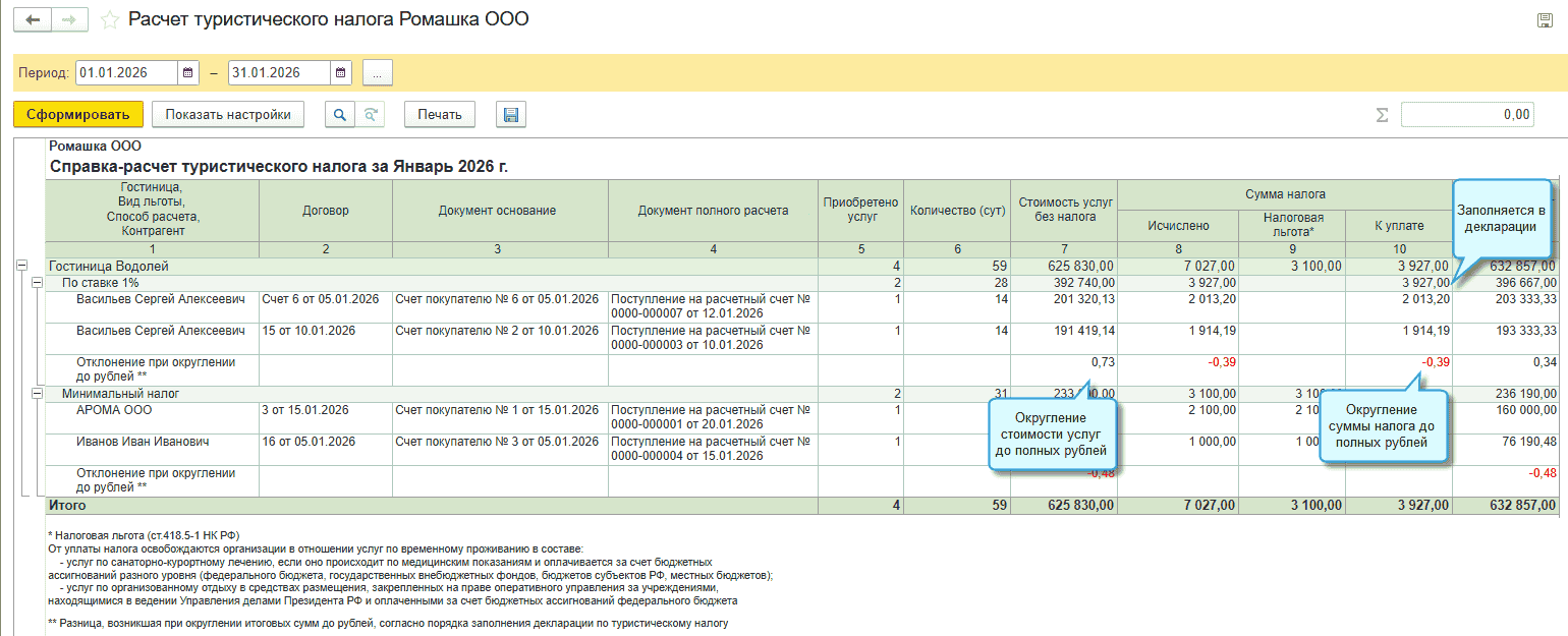 С января 2026 г. туристический налог рассчитывается ежемесячно. Сделано это в связи с проектом декларации по туристическому налогу с 2026 года. Если в течение квартала изменится ставка налога, то потребуется заполнить отдельные листы декларации по месяцам. Стоимость услуг и сумма налога в расчете теперь округляются до полных рублей.