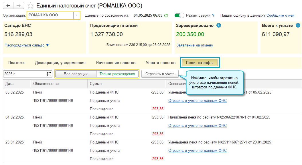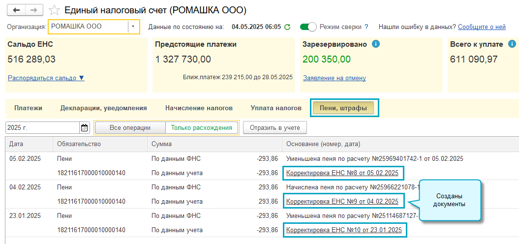 Начисление пеней, штрафов по данным Личного кабинета ЕНС в «1С:Бухгалтерии»