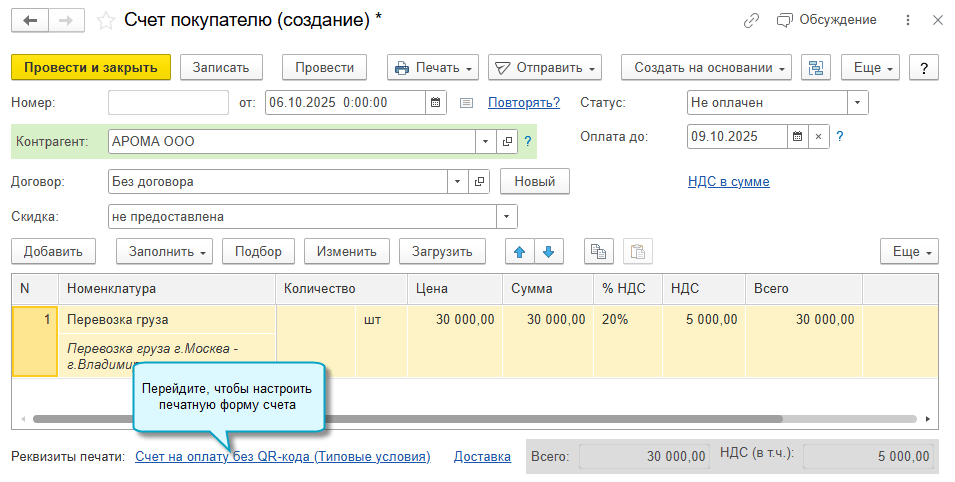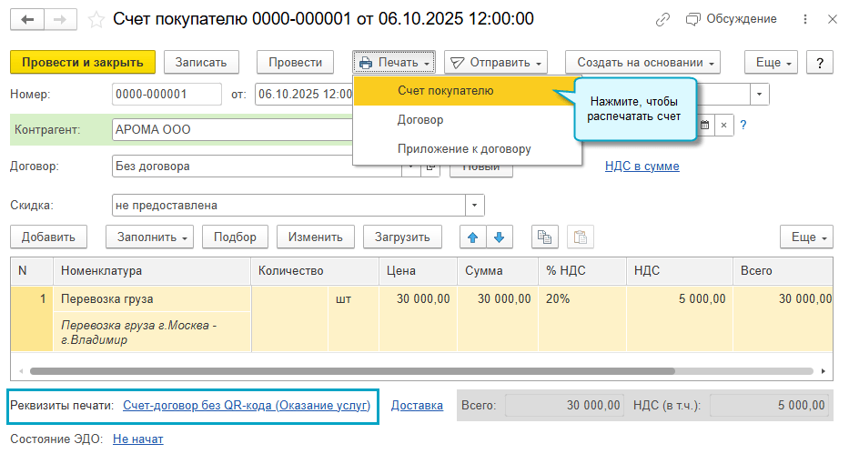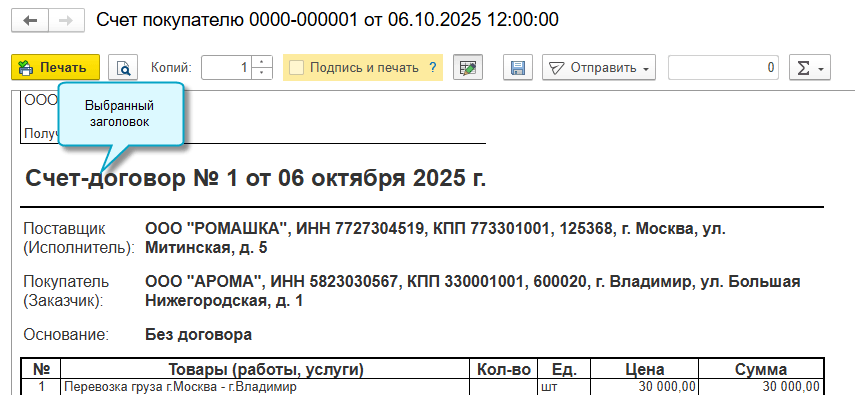 Печать счета-оферты или счета-договора в «1С:Бухгалтерия 8»