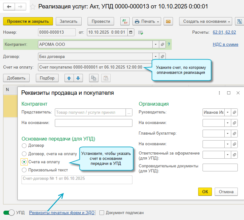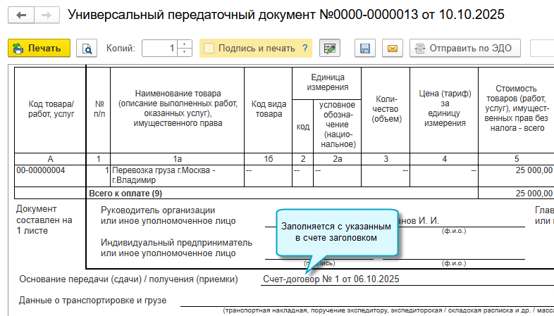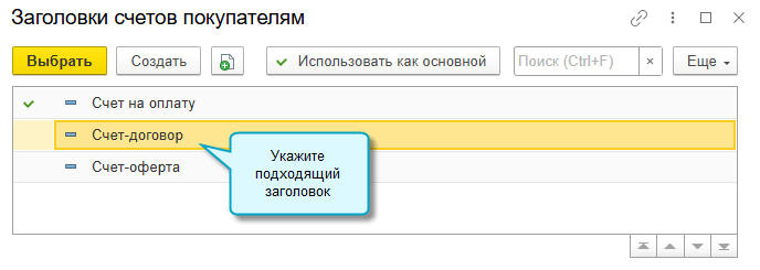 В программе «1С:Бухгалтерия 8» начиная с релиза 3.0.185 добавлена возможность указать, с каким заголовком распечатать счет покупателю: счет на оплату, счет-оферта, счет-договор или другой вариант. Выбранный заголовок заполняется потом в УПД в основании передачи, если в нем требуется указать счет.