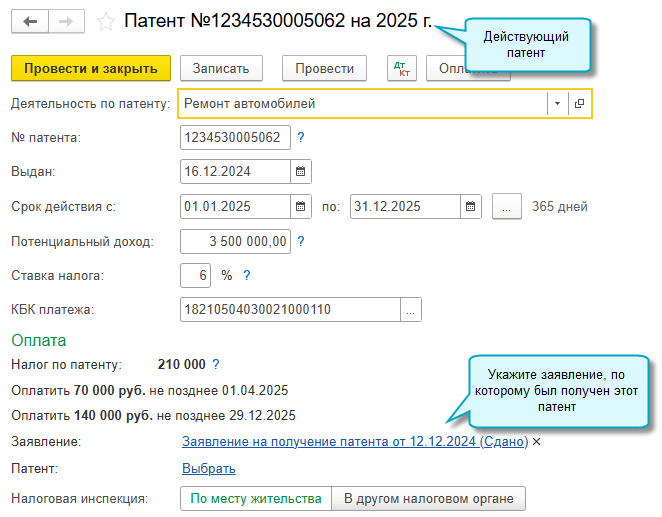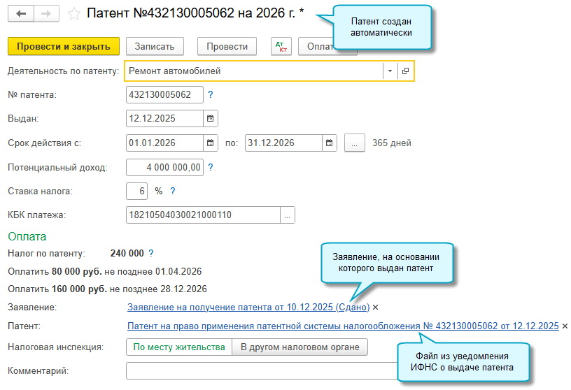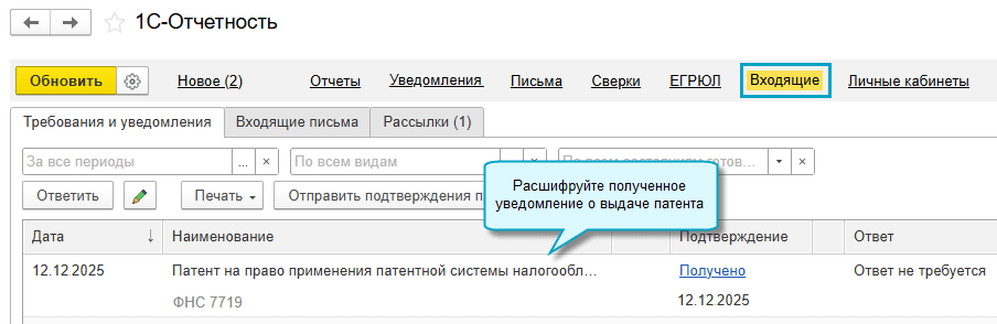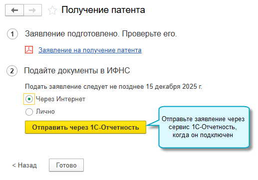 Если заявление отправить в ИФНС через сервис «1С-Отчетность», то при получении патента из ИФНС он автоматически добавится в список патентов в программе.