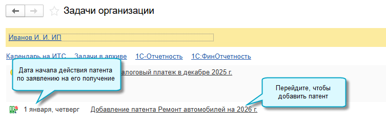 Если сервис «1С-Отчетность» не подключен, потребуется вручную добавить патент. Чтобы не пропустить срок начала действия нового патента, добавлена задача организации.
