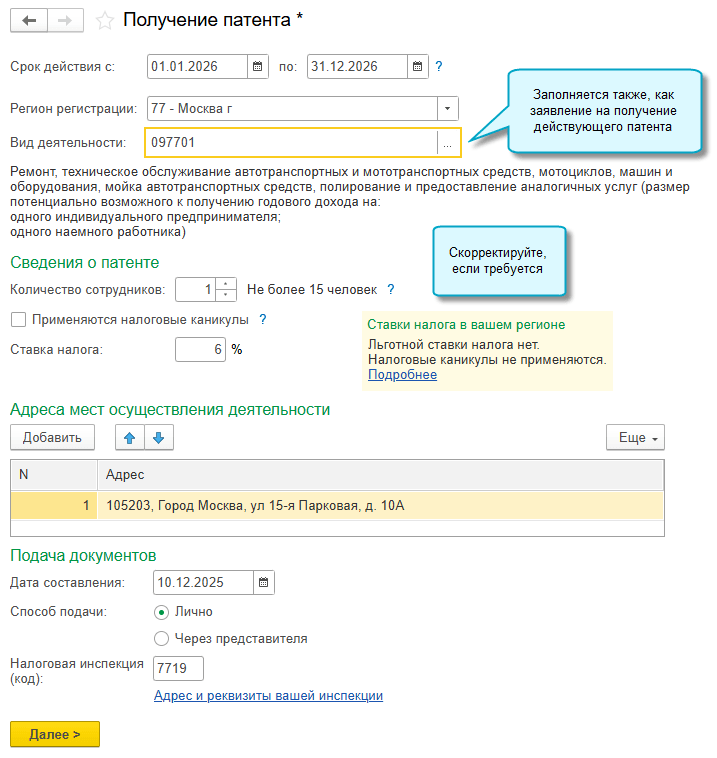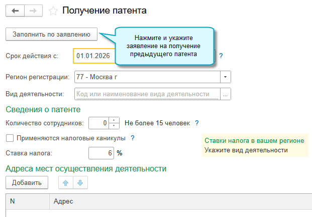 В программе «1С:Бухгалтерия 8» начиная с релиза 3.0.184 добавлена возможность заполнить заявление на получение патента на следующий период по данным предыдущего заявления.