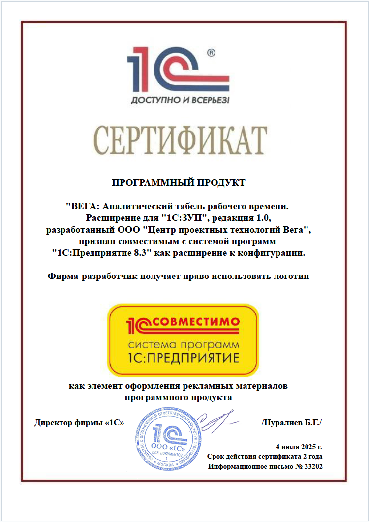 Продукт «ВЕГА: Аналитический табель рабочего времени» получил сертификат «Совместимо! Система программ 1С:Предприятие»