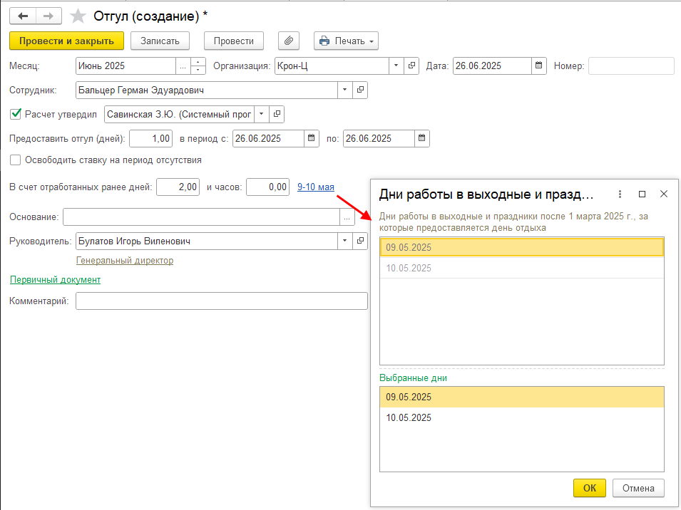 В связи с этим в программе «1С:Зарплата и управление персоналом» начиная с релизов 3.1.30.225 и 3.1.34.33 реализована возможность при регистрации отгула указать дни, за которые он предоставляется (начиная с 01.03.2025).
