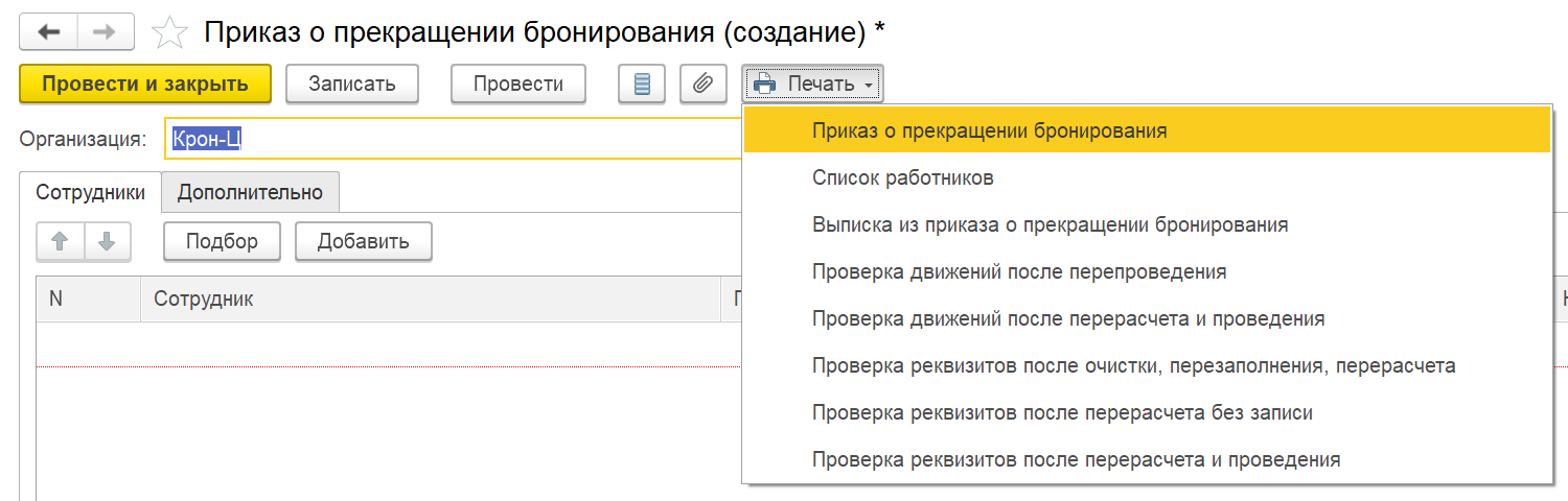 - Добавлена печатная форма для документа «Приказ о прекращении бронирования»: