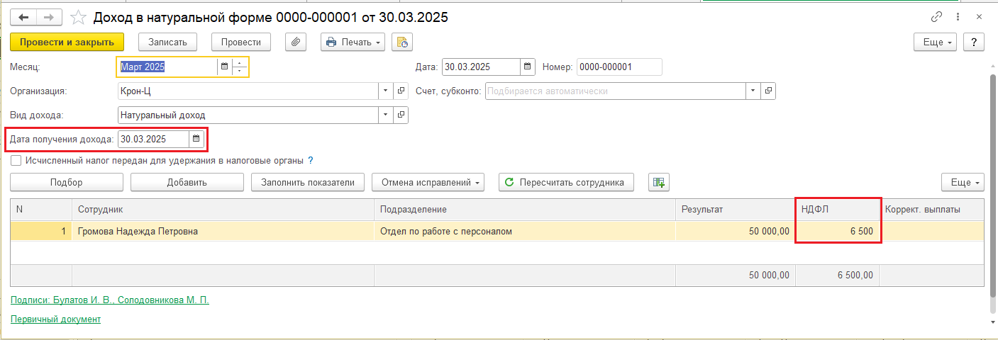 Начисление отражается в 1С:ЗУП 3.1 специальным документом Натуральные доходы (Раздел Зарплата). Рассмотрим пример. Сотруднику начислен натуральный доход в сумме 50 000 рублей, сумма НДФЛ составляет 6 500 рублей (Рис. 5).