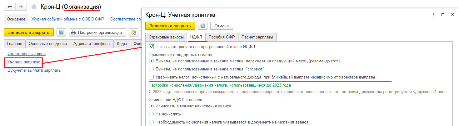 Сумму НДФЛ следует удержать, при следующей выплате, если установлена настройка Удерживать налог, исчисленный с натурального дохода, при ближайшей выплате независимо от характера выплаты в настройках Учетной политики Организации (Раздел Настройка – Организации (Реквизиты организации) – Учетная политика и другие настройки - Учетная политика – закладка НДФЛ) (Рис. 6).