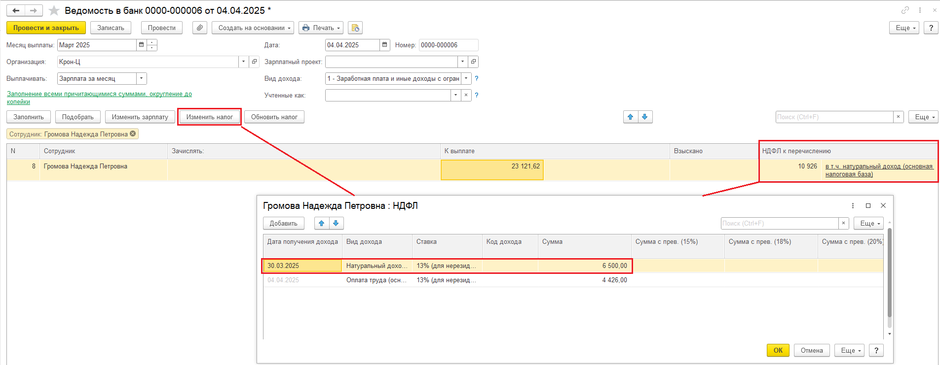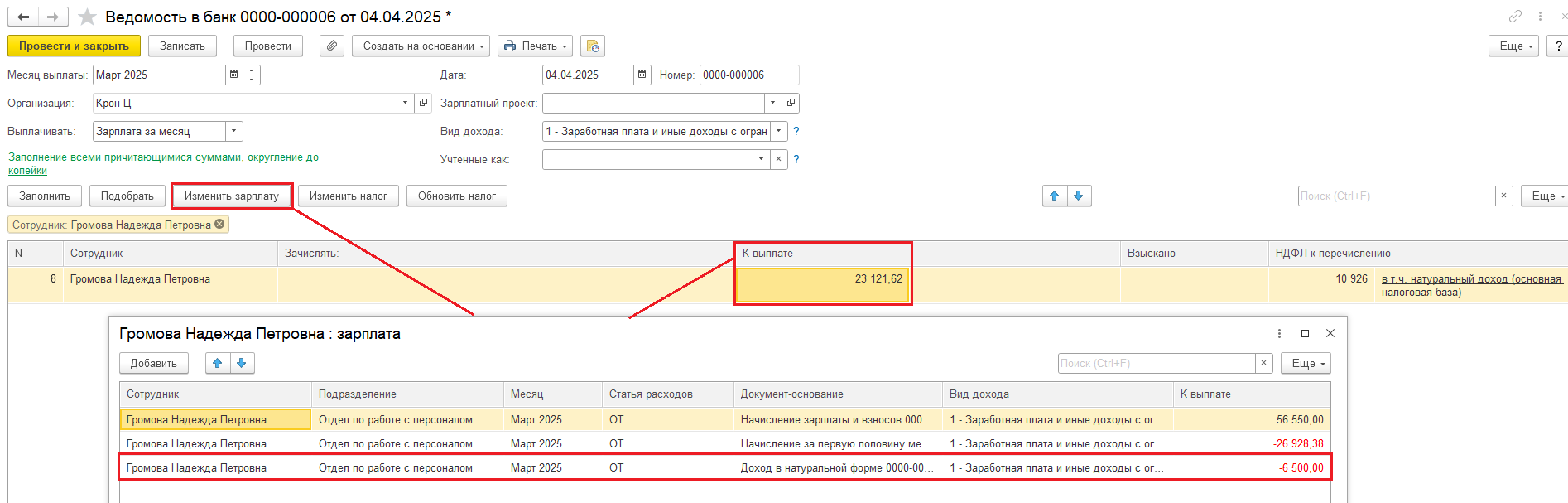 Кроме того сумма К выплате должна быть уменьшена на сумму НДФЛ с Натурального дохода. Проверить можно по кнопке Изменить зарплату в Ведомости на выплату.