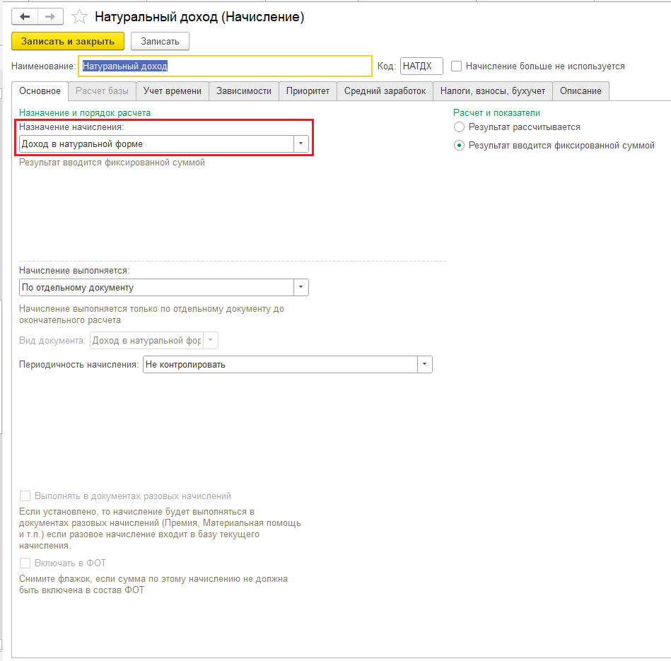 Рис. 3. Карточка вида начисления Натуральный доход. Закладка Основное